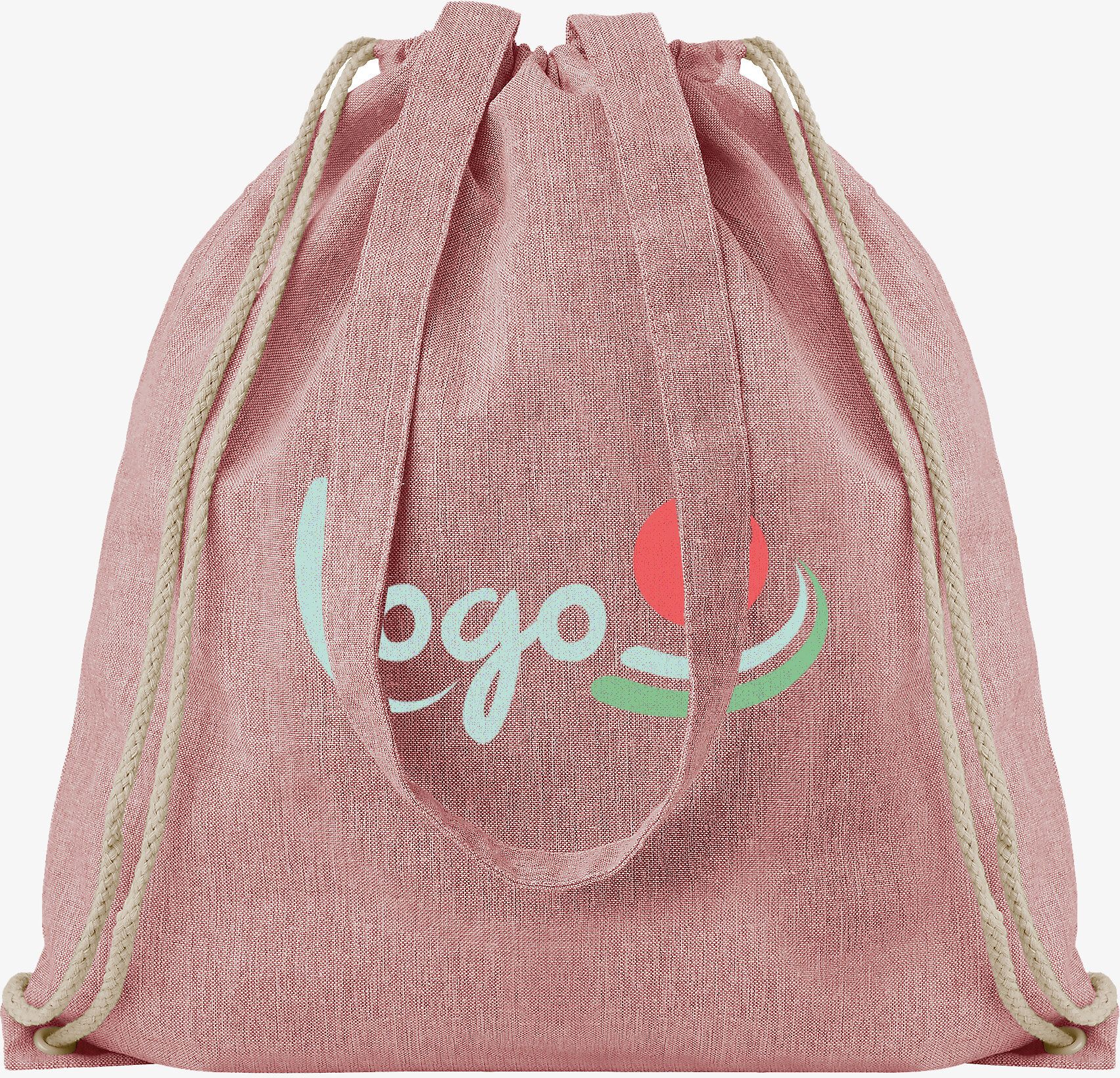 Sac à dos avec anses type tote bag. Longues anses et ordelettes de serrage coloris naturel. Œillets de renforts aux coins. Dimensions : 38 x 42 cm. Composition : 80% polyester recyclé, 16% coton recyclé, 2% viscose, 2% polyamide