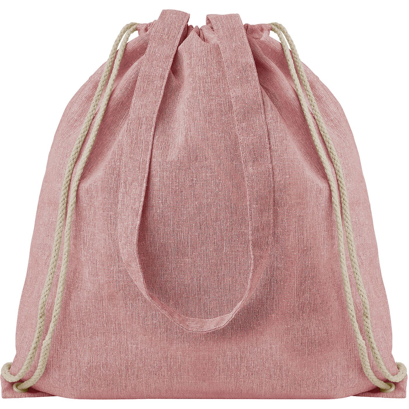 Sac à dos avec anses type tote bag. Longues anses et ordelettes de serrage coloris naturel. Œillets de renforts aux coins. Dimensions : 38 x 42 cm. Composition : 80% polyester recyclé, 16% coton recyclé, 2% viscose, 2% polyamide