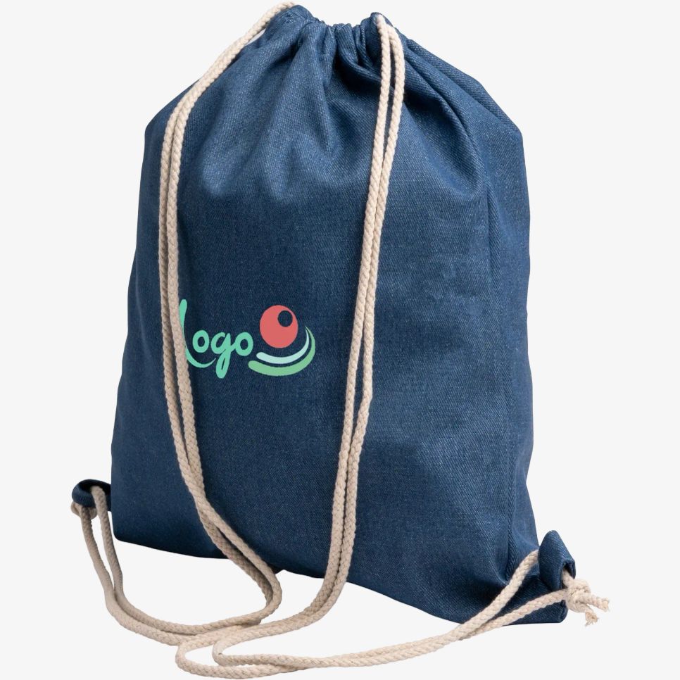 Le sac gym Boney en denim recyclé avec cordon de serrage convient au transport d’affaires de sport ou du quotidien. Composition : tissu denim. Dimensions : 36 x 42 cm. Personnalisation possible.