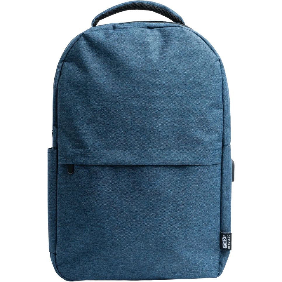 Le sac à dos Gregor en polyester RPET 600 D avec finition chinée comprend un compartiment principal rembourré pour ordinateur ou tablette et un port USB intégré pour relier un bloc d\"alimentation (non fourni). Capacité 15 L, dimensions 29 x 43 x 13 cm. Personnalisable.