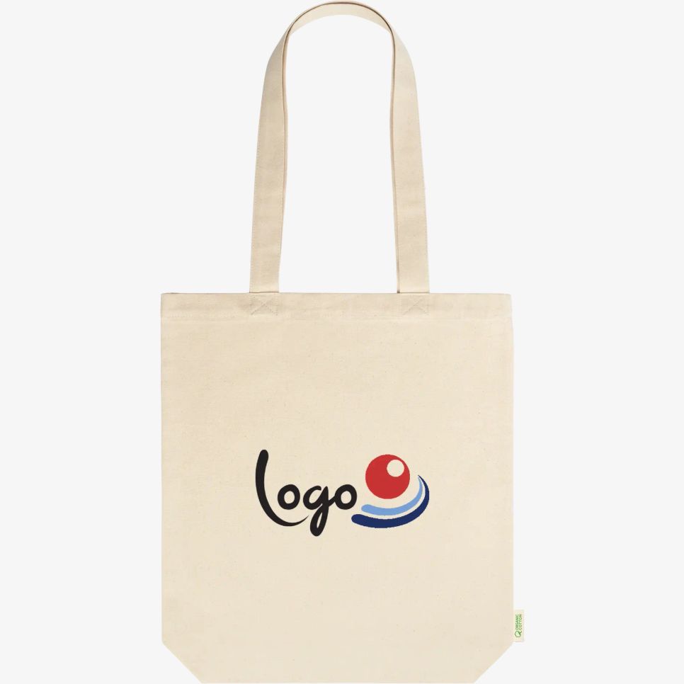 Le sac shopping coton biologique Kensal convient au transport quotidien, avec un soufflet pour augmenter la contenance et des anses de 70 cm pour un porté épaule. Personnalisable.