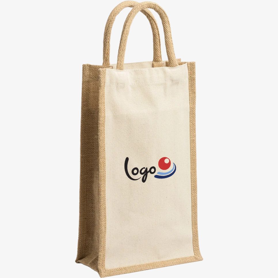 Le sac shopping Loire en jute et coton, avec double compartiment et anses renforcées. Format 20 x 10 x 35 cm, adapté au transport de deux bouteilles.