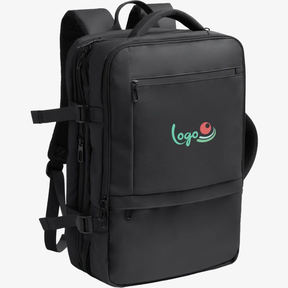 Le sac à dos Rayan extensible en cuir PU convient aux déplacements et au voyage grâce à sa capacité de 40 L, son dos rembourré et sa sangle trolley. Poche avant à fermeture à glissière, compartiment principal, poche intérieure matelassée pour ordinateur portable 17\", et poche antivol au dos. Personnalisation possible. Dimensions : 31 x 47 x 18 cm. Composition : cuir PU.