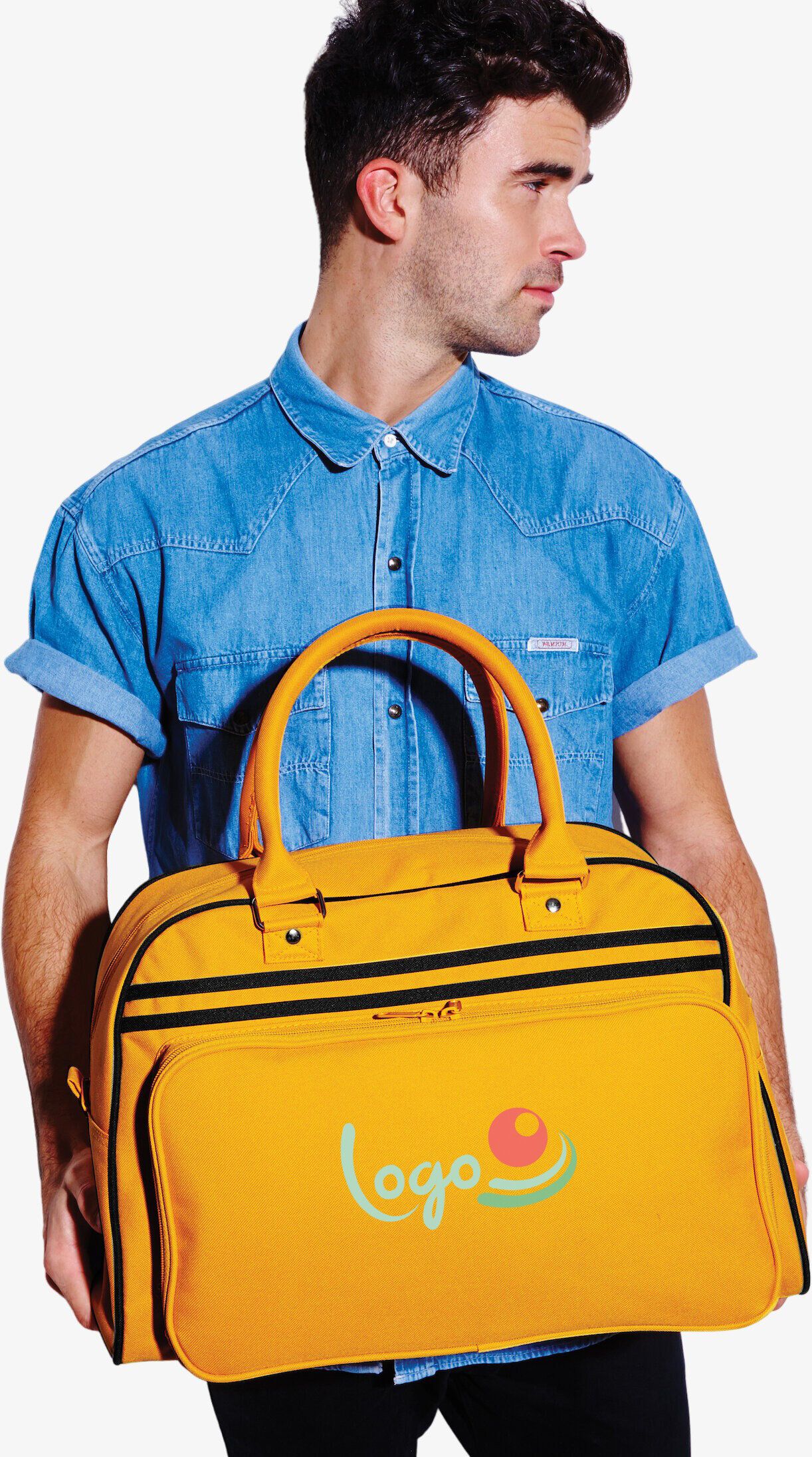 600D polyester. Fermeture zippée. 1 poche zippée à l'intérieur + 1 poche filet. Look «rétro». Capacité 23 litres. Dimensions 44 x31x25cm.