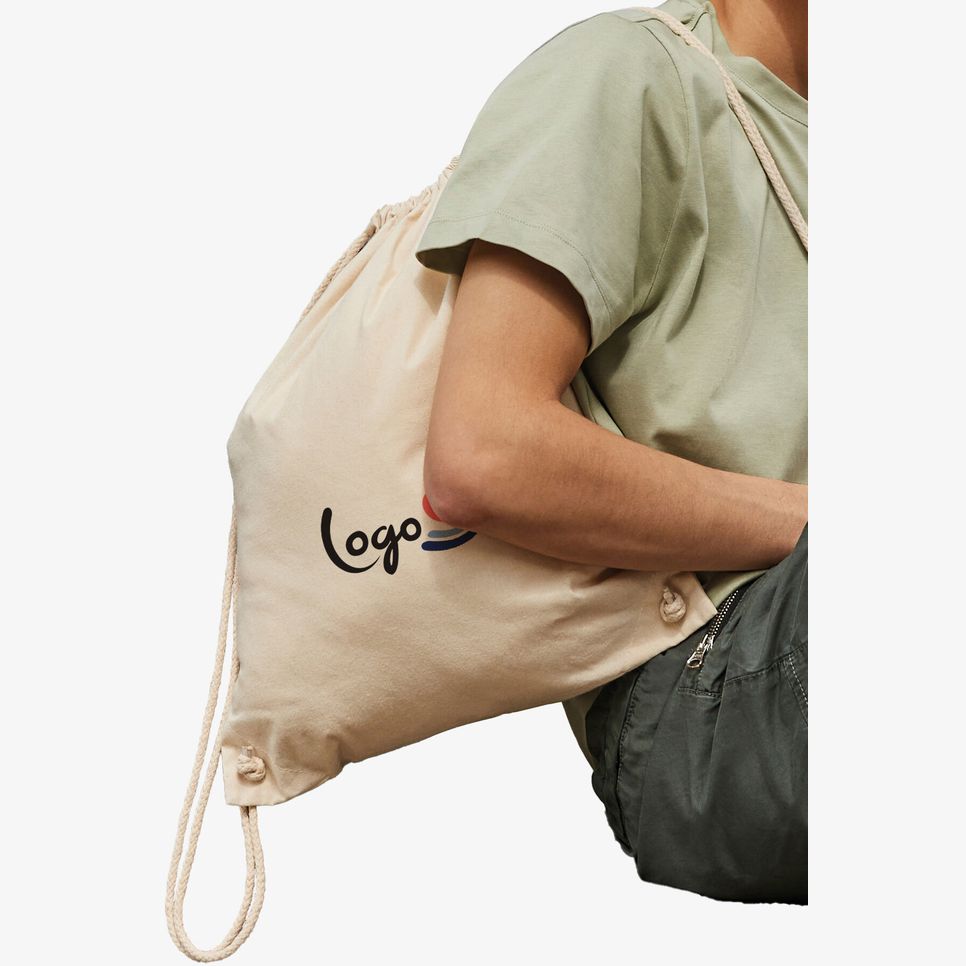 Le Sac gym Coton Recyclé est un sac à dos en 100% coton recyclé, conçu pour transporter des affaires au quotidien ou pour le sport. Format 37 x 46 cm, capacité 12 L, surface adaptée à la personnalisation.