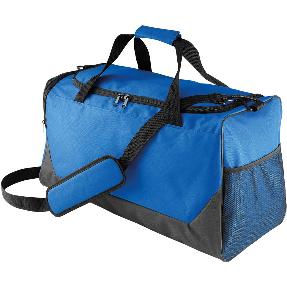 Le Sac de Sport en polyester 600D avec enduction PVC dispose de 2 poches côté, d'une poche filet et d'un compartiment pour rangement chaussures. Lanière d'épaule amovible. Dimensions : 55 x 32 x 26 cm.