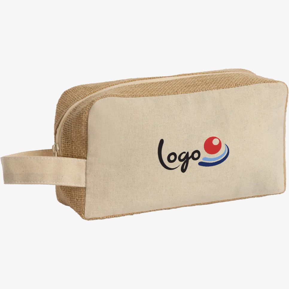 La trousse pochette Siena en coton jute avec coton laminé jute et fermeture zippée à tirette jute assortie. Format adapté pour ranger des articles de toilette ou des accessoires, avec possibilité de personnaliser.