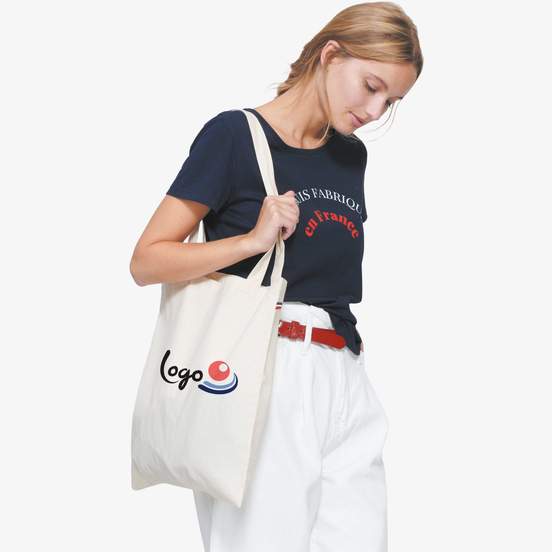 Ces élégants sacs à provisions (tote-bags) en coton sont fabriqués en France et peuvent être personnalisés avec votre logo. Ils sont dotés de deux poignées, ce qui vous permet de porter le sac à la main ou à l'épaule, selon vos préférences. De plus, le détail tricolore sur le côté ajoute une touche de style unique. La taille de chaque sac est de 39x42cm pour une capacité de 10 litres. Grammage : 150g/m². Composition 100% coton, issu de l'agriculture biologique.