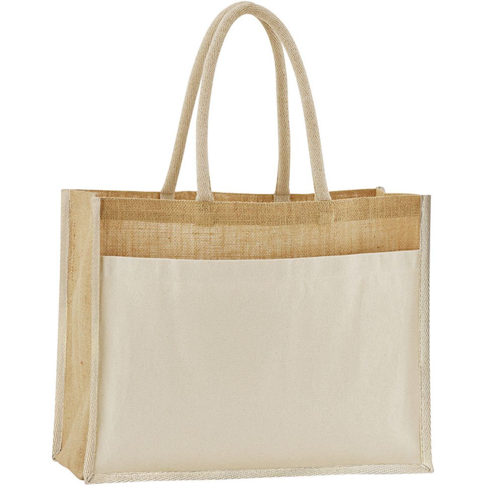 Le Tote bag Pocket Coton jute Amidonné Naturel est un sac shopping à structure marquée, conçu pour un rangement organisé. Toile de jute non plastifiée, poche avant en toile de coton. Format 42 x 33 x 19 cm, contenance 21 litres. Personnalisable.