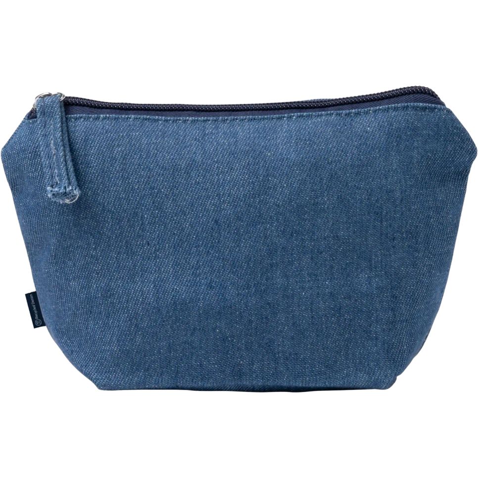 La trousse pochette Wesly en denim recyclé avec fermeture zippée convient au rangement d’accessoires de toilette ou de petits objets. Format 21 x 13 x 8 cm. Composition : tissu denim.