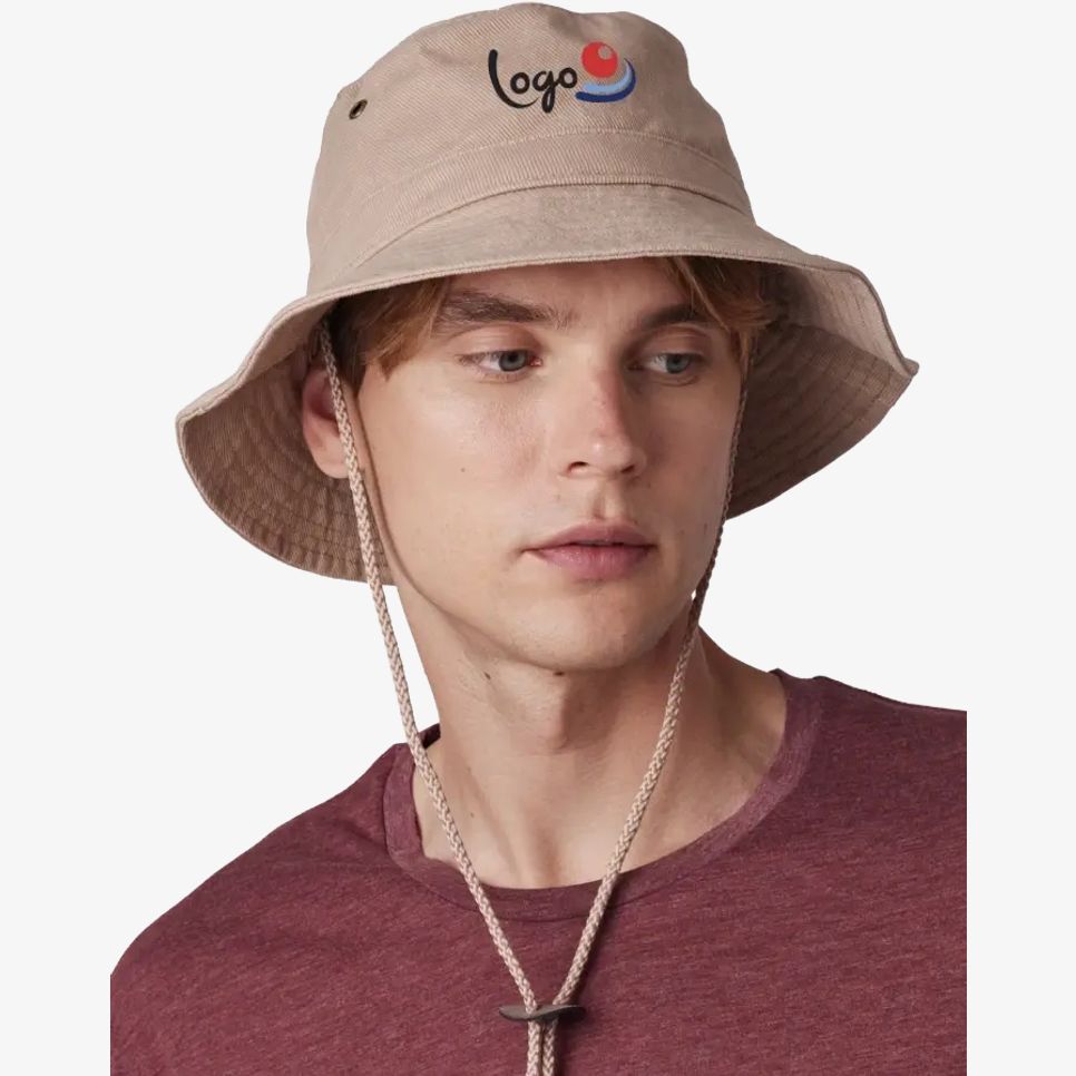 Le chapeau Baroudeur en coton sergé brossé possède des surpiqûres sur le pourtour, une bande de renfort sur la calotte et une lanière réglable avec stoppeur cuir. 4 œillets métalliques facilitent l’aération. Personnalisable.