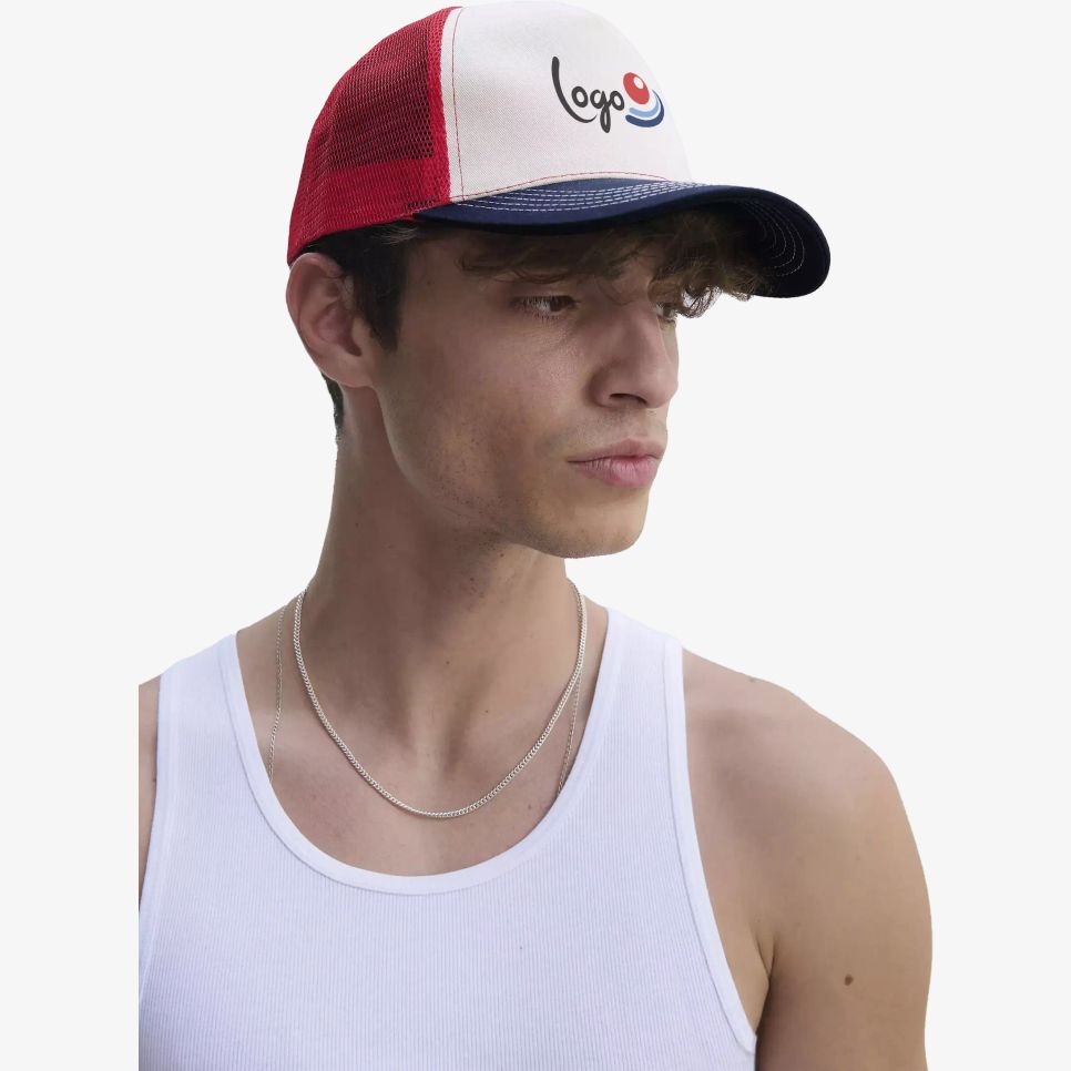 La casquette Blink 5 panneaux combine un panneau avant en coton brossé et un arrière en filet mesh 100% polyester. Fermeture Snapback avec réglette plastique. Composition : coton, polyester. Personnalisation possible.