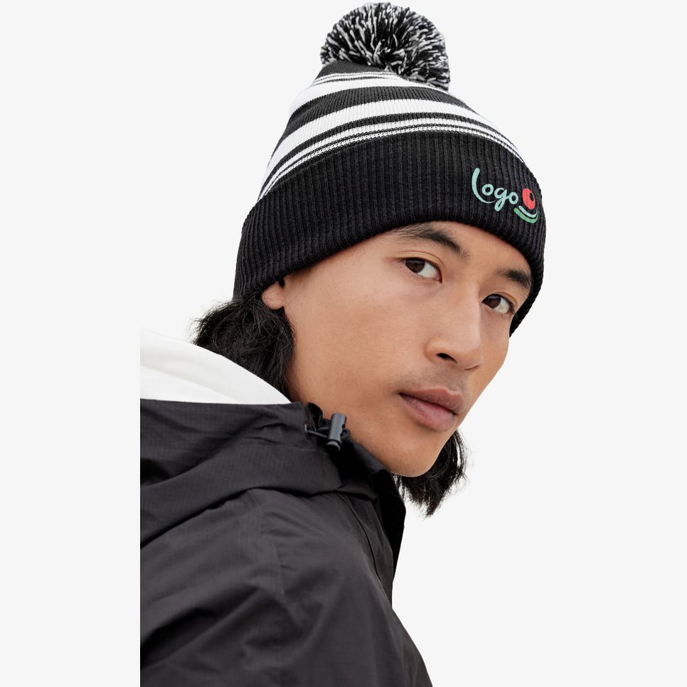 Le Bonnet Rayé Supporter est un bonnet à pompon bicolore en tricot double couche, avec conception à revers. Taille unique et étiquette détachable. Personnalisation possible.