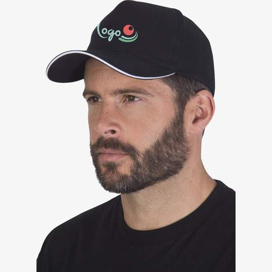 La casquette 5 pans avec panneau frontal renforcé et visière sandwich contrastée. Fermeture par boucle métal. Modèle personnalisable. Composition : 100% coton sergé.