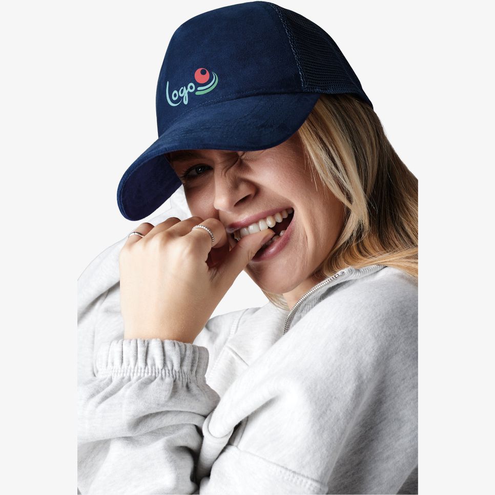 La casquette filet daim à 5 panneaux avec panneau avant structuré et visière précourbée. Taille unique ajustable via fermeture plastique. Personnalisation possible.