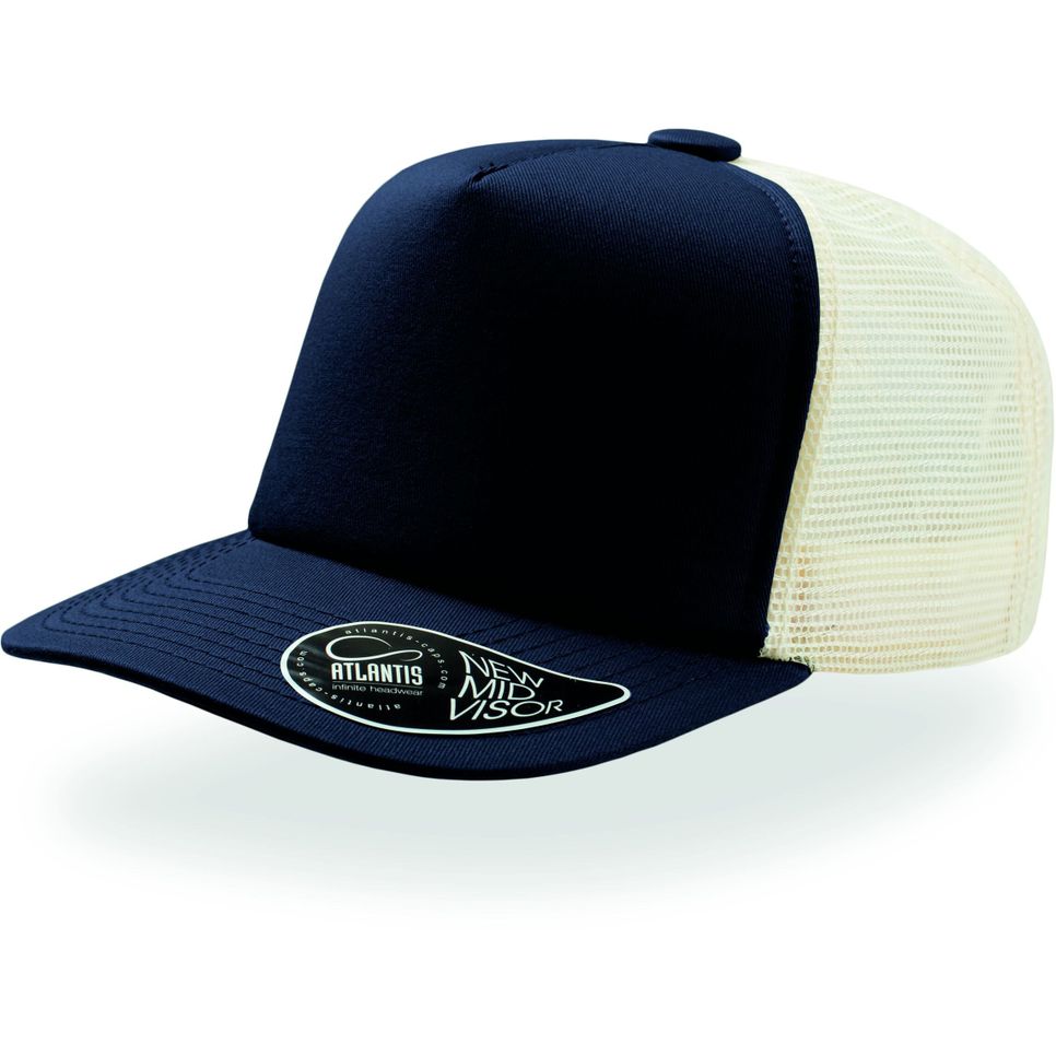 Casquette 5 panneaux. Nouvelle visière "Mid Visor" avec 5 coutures. Ajustable par picots en PVC. Arrière de la casquette en filet. Composition : 100% coton twill chino front et visière.