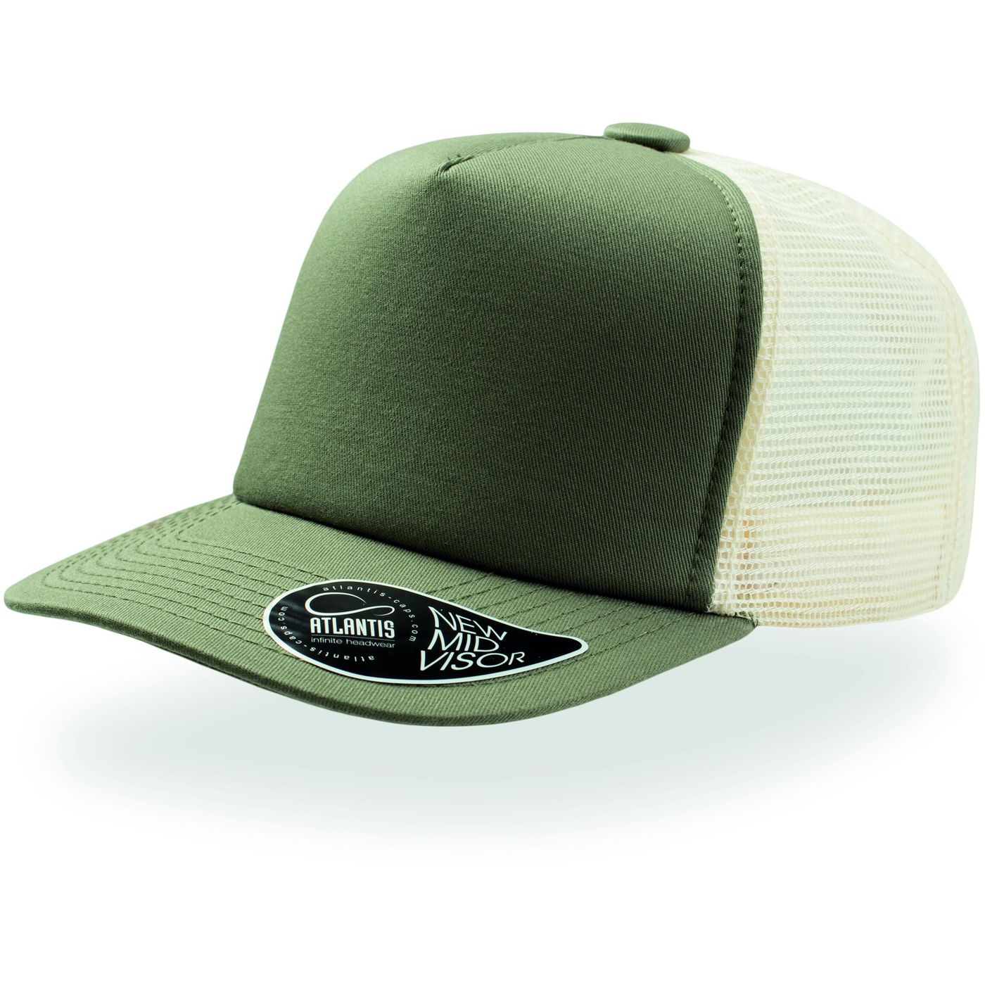 Casquette 5 panneaux. Nouvelle visière "Mid Visor" avec 5 coutures. Ajustable par picots en PVC. Arrière de la casquette en filet. Composition : 100% coton twill chino front et visière.