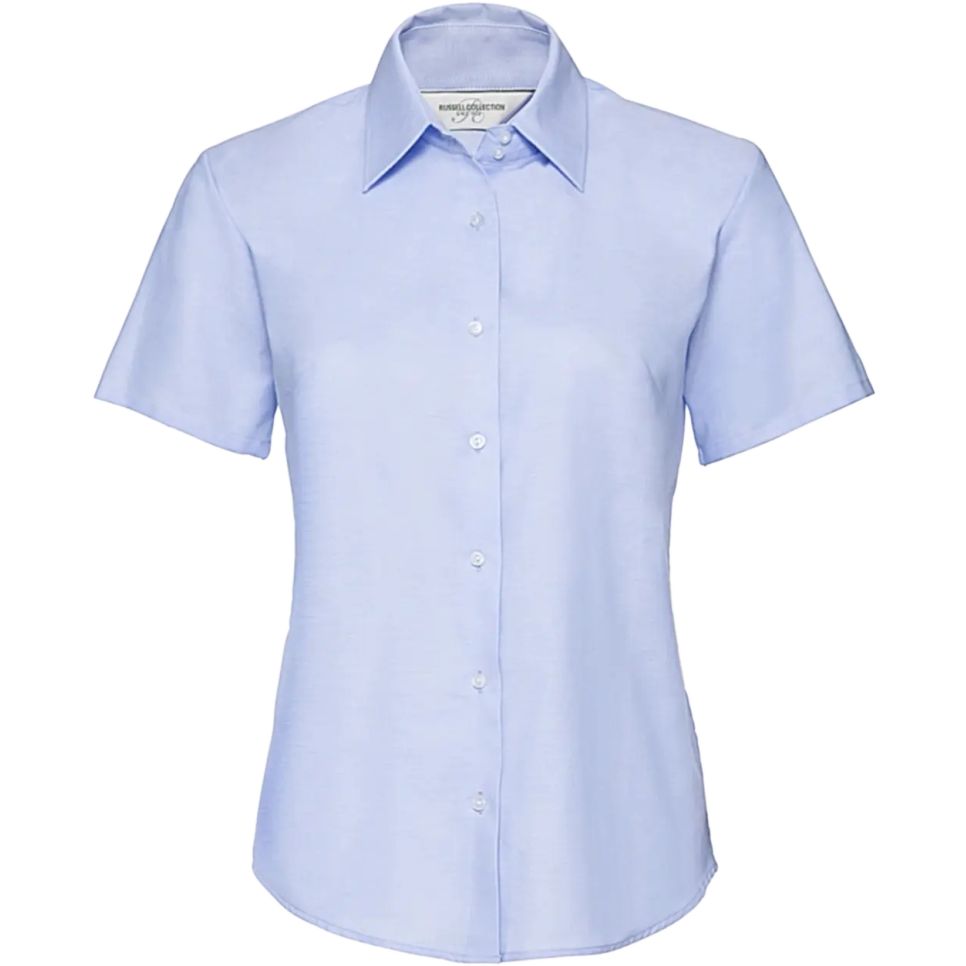 La Chemise Oxford Cintrée Manches Courtes Femme convient aux usages professionnels ou quotidiens, avec col à 2 boutons, pinces devant et dos et base mi-arrondie. Composition : 70% coton, 30% polyester.