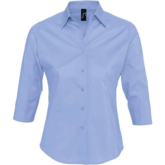 La chemise femme stretch Effect en popeline associe coton et \u00e9lasthanne pour un port ajust\u00e9. Manches 3/4, coupe cintr\u00e9e, col \u00e0 bouton unique, 7 boutons ton sur ton, revers \u00e0 fente et pinces devant/dos. Personnalisable.