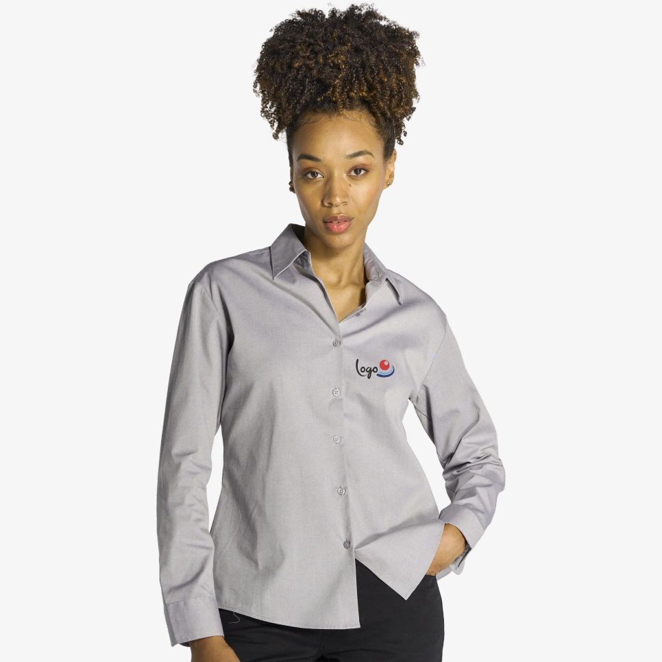 La chemise Oxford femme manches longues, coupe cintrée et boutons ton sur ton, convient aux usages professionnels et à la tenue quotidienne. Personnalisable.