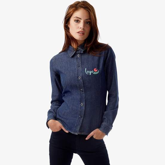 La chemise femme denim Vision Women à manches longues en coton à finition lavée. Coupe ajustée avec pinces poitrine et dos, col avec rabat, bas arrondi et détails décoratifs. Personnalisable.