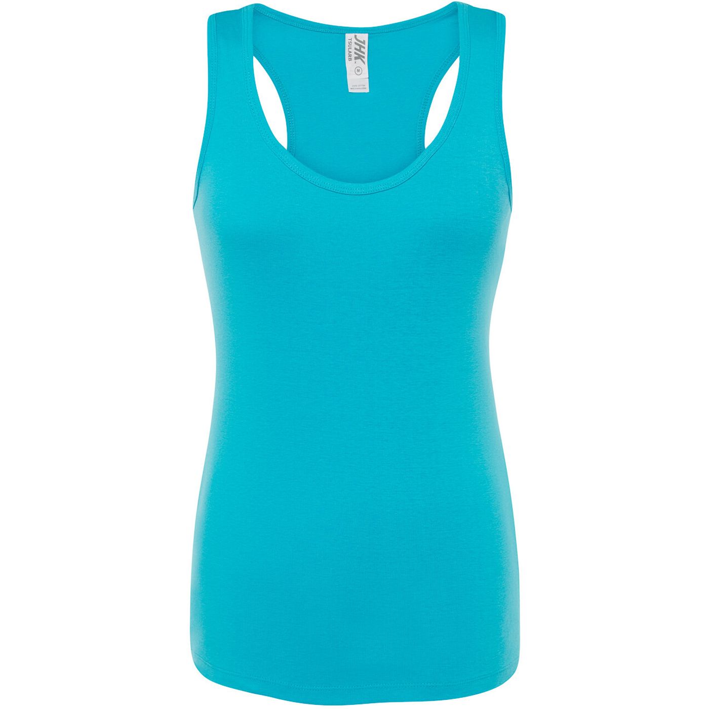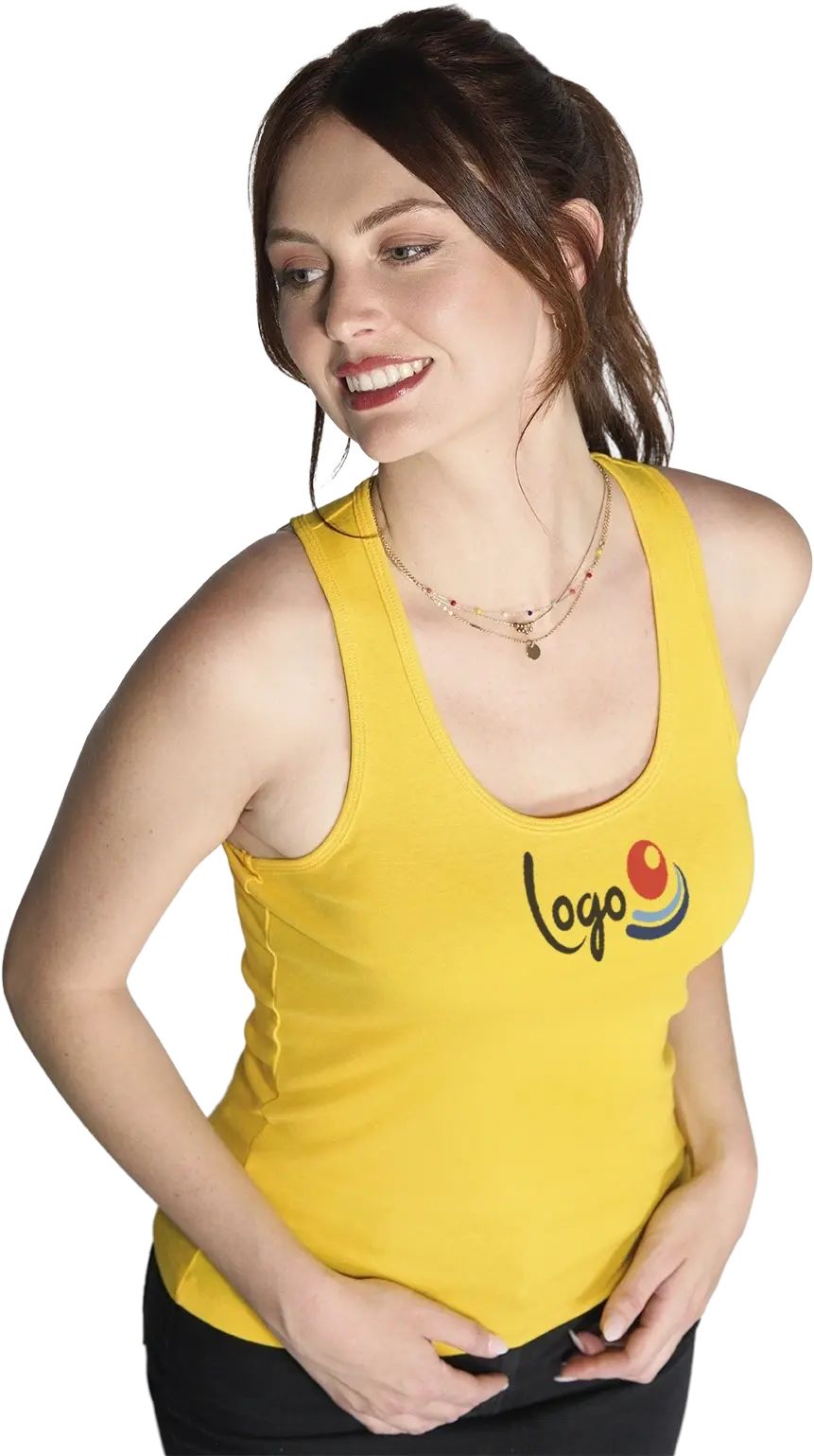 Débardeur femme Aruba. Dos nageur. Coupe ajustée. Étiquette amovible. Bords côte 1x1. Composition : 100% coton cardé
