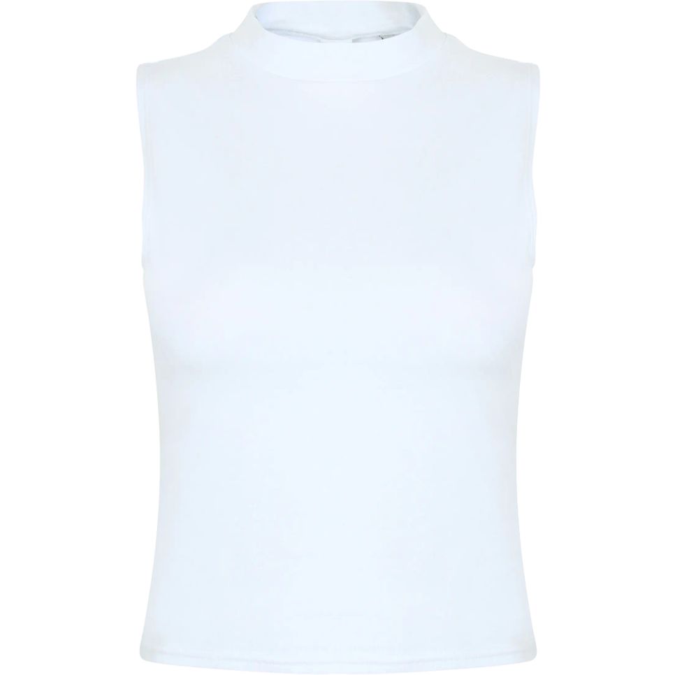 Le débardeur crop top à col montant pour femme présente une coupe raccourcie à la taille et un col cheminée en tissu. Il comprend des surpiqûres doubles autour des poignets et des ourlets ainsi qu'une étiquette détachable. La composition principale est de 96% coton et 4% élasthanne.