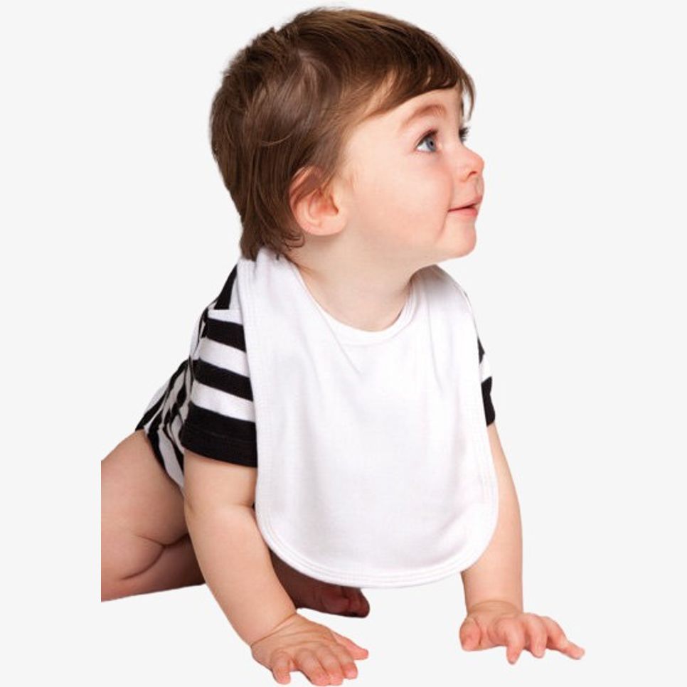 Le bavoir Baby bib en coton ringspun, doublé, avec biais sur les côtés et fermeture auto-aggripante au dos. Utilisation adaptée pour limiter les taches lors des repas et permettre une personnalisation.