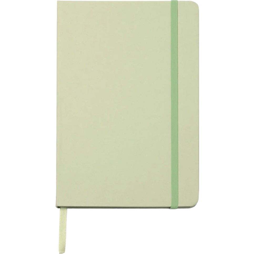 Le bloc-notes Fruti au format A5 avec couverture rigide en déchets fruits comprend 80 feuilles lignées, un marque-page et un élastique assorti. Personnalisable.