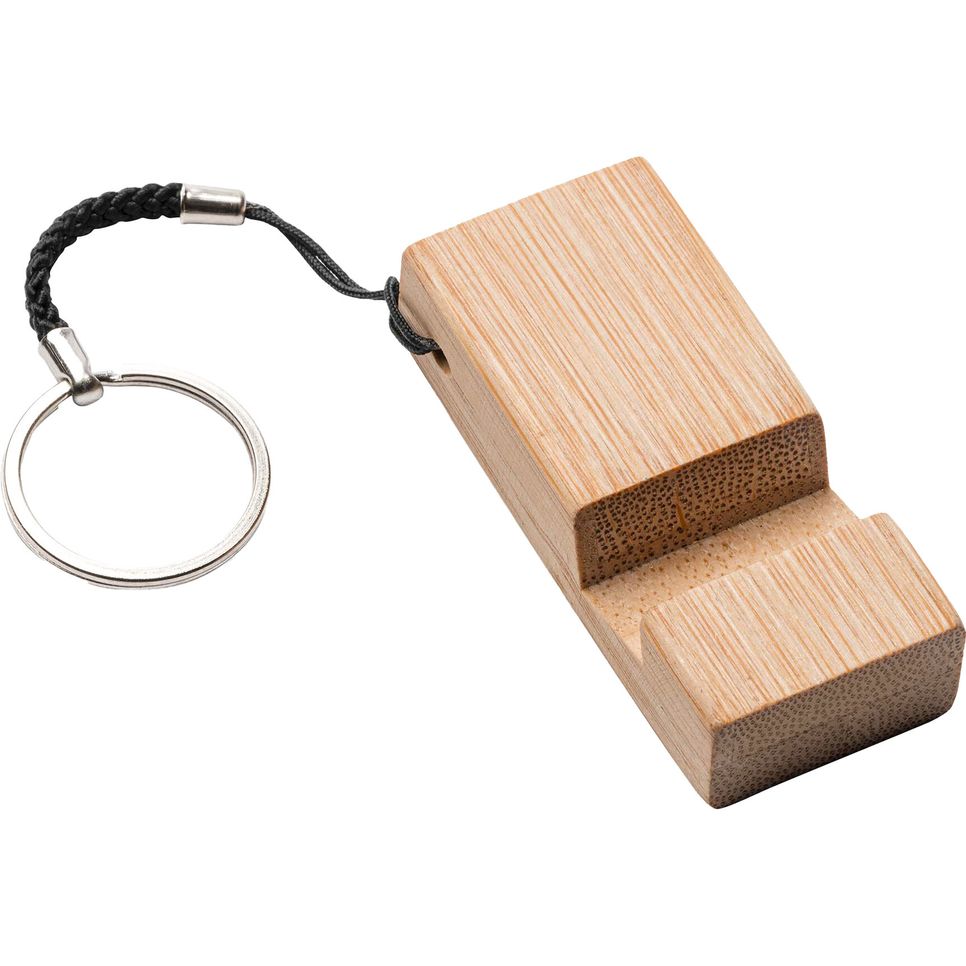 Le porte-clés Stelo en bambou intègre une fonction support portable pour maintenir un smartphone en position stable. Utilisation pratique au bureau ou en déplacement. Composition : bambou.
