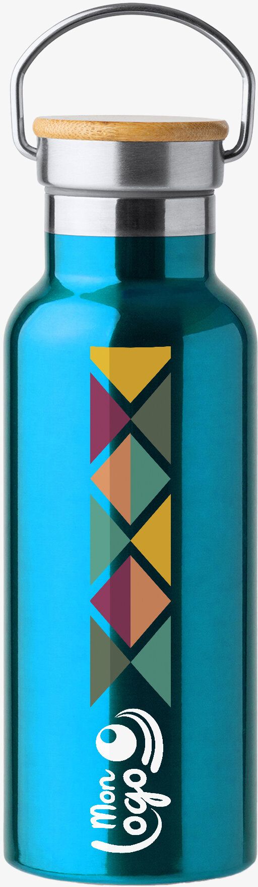Bouteille en acier inoxydable 304 à double paroi avec couvercle en bambou. Capacité de 500 ml. Poignée en métal pliable. Disponible dans une grande variété de couleurs. Composition : acier inoxydable, bambou.