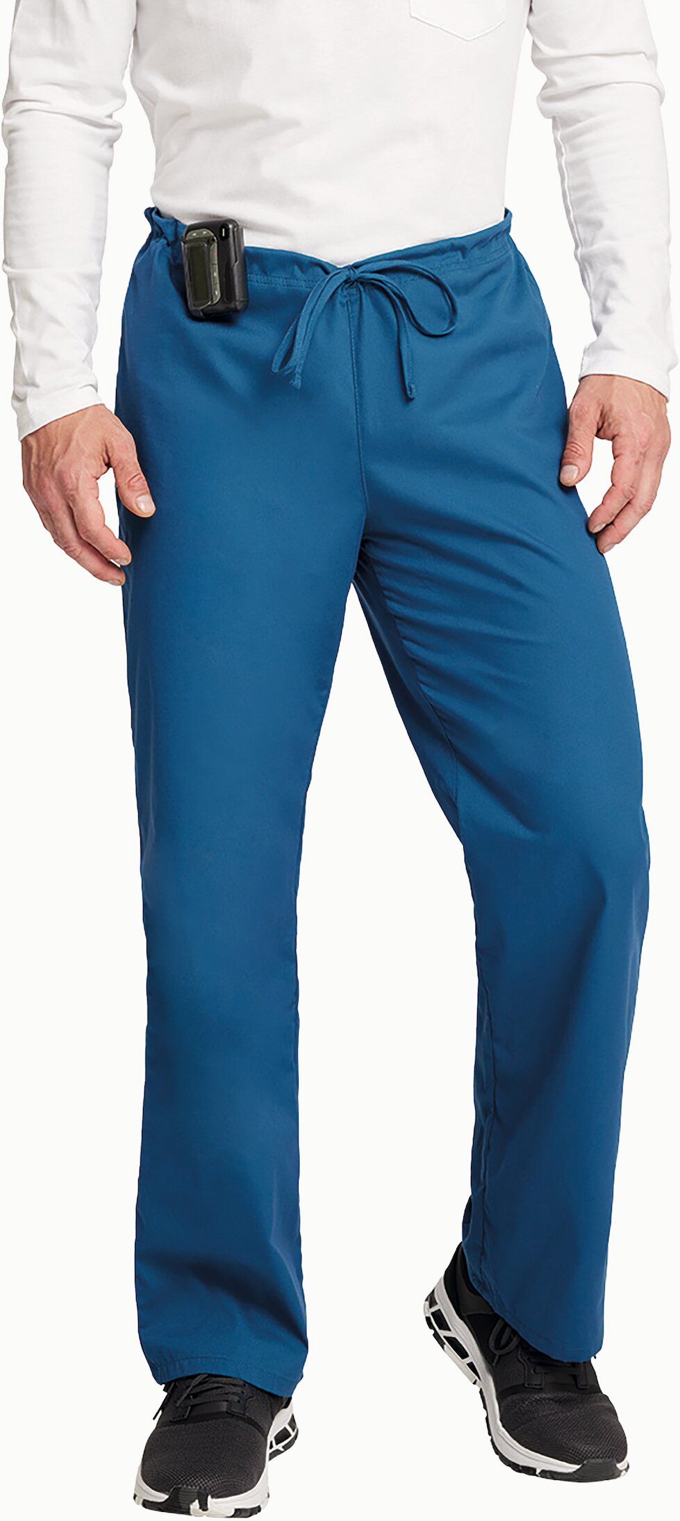 Pantalon de travail unisexe. Coupe unisexe avec cordon de serrage. Poche arrière avec poche intérieure en tricot bleu (tricot blanc pour le white). Composition : 55% coton, 45% polyester.