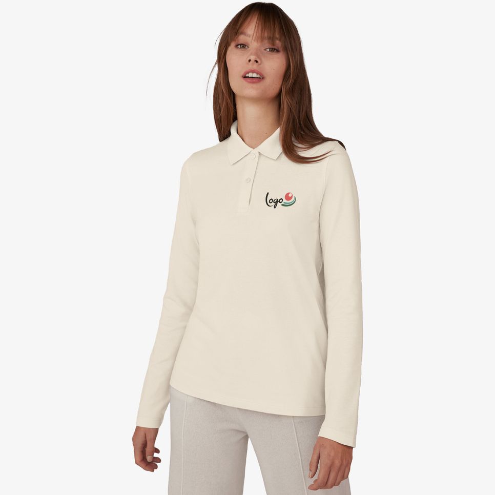 Le polo My polo 180 pour femme en maille piquée, à manches longues, avec patte renforcée 2 boutons, col bord-côte 1x1, coutures latérales et bande de propreté au col. Boutons ton sur ton. Conçu pour être personnalisé.