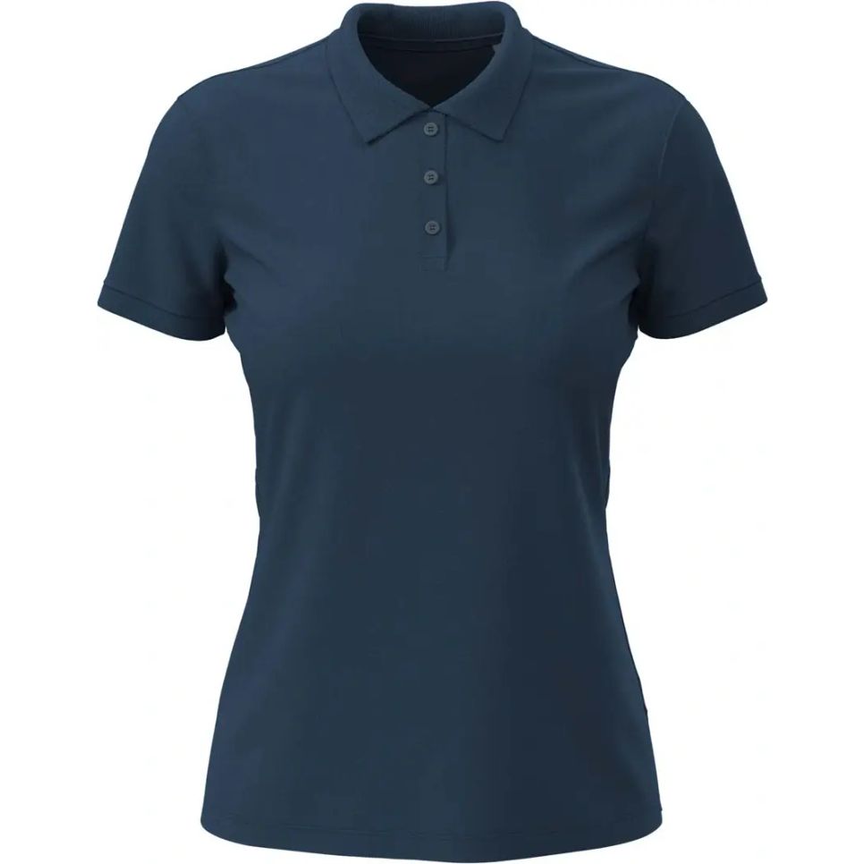 Le polo pour femmes présente une coupe féminine en coton piqué simple 100 % coton. Il comprend un col et des poignets côtelés ainsi que trois boutons ton sur ton. Un bandeau nuque assorti complète sa conception. L'étiquette taille est tissée à l'encolure et une étiquette d'entretien se trouve dans la couture latérale.