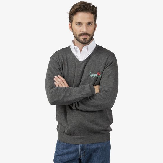 Le pull col V pour homme convient aux usages quotidiens et professionnels, avec manches droites et finitions en côte 1x1 au tour de cou, poignets et ourlet. Personnalisable.