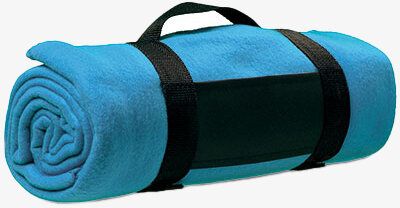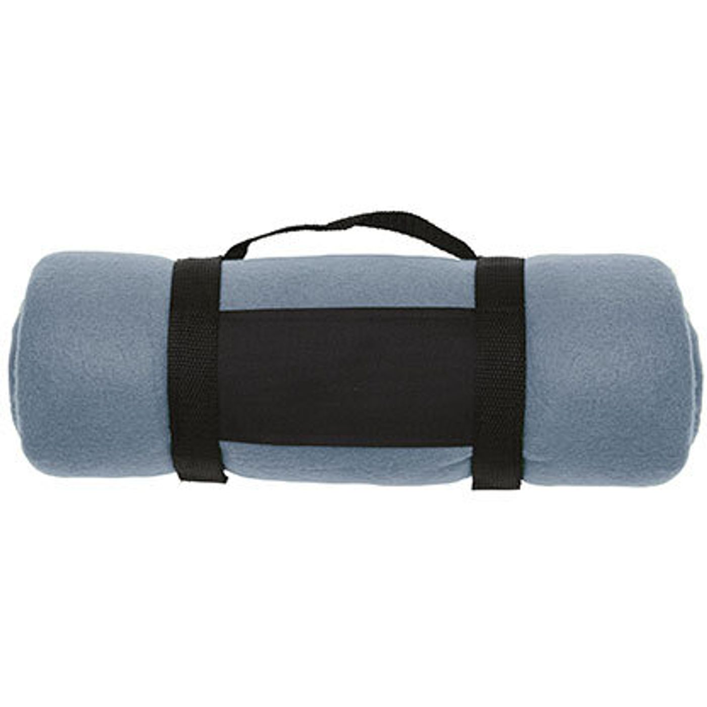 Couverture en polaire enroulable avec dragonne en nylon noir. Dimensions : 162 x 125 cm. Composition : 100% polyester.