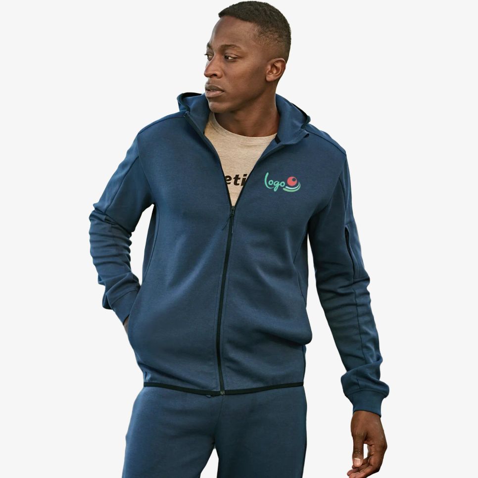 Le sweat à capuche Athletic Sweat zip est un modèle zippé conçu pour un usage quotidien ou sportif. Il comprend deux poches ouvertes sur le devant, une poche zippée sur la manche, des poignets en tissu et une taille élastiquée. Sa matière associe coton ringspun et polyester. Il peut être personnalisé.