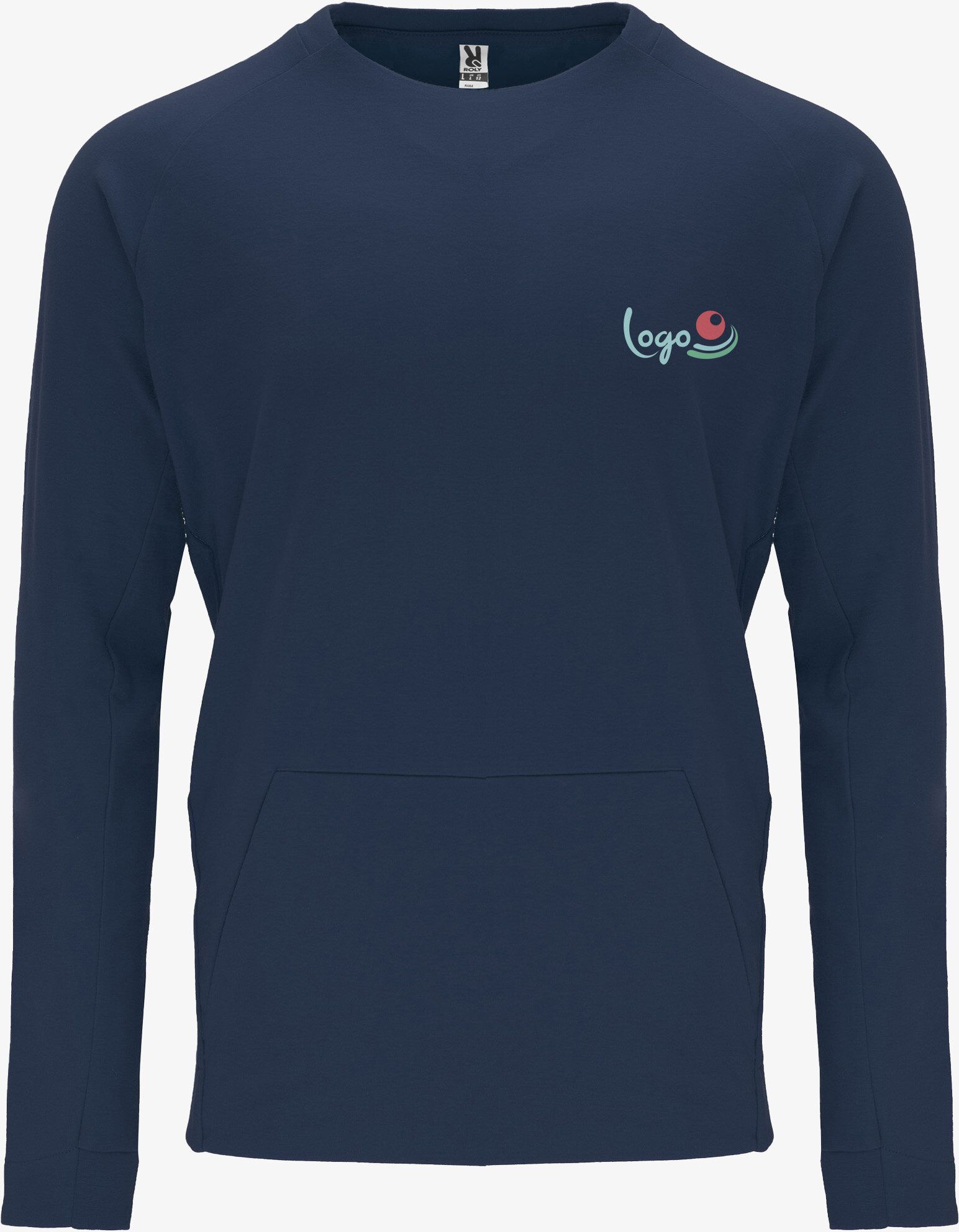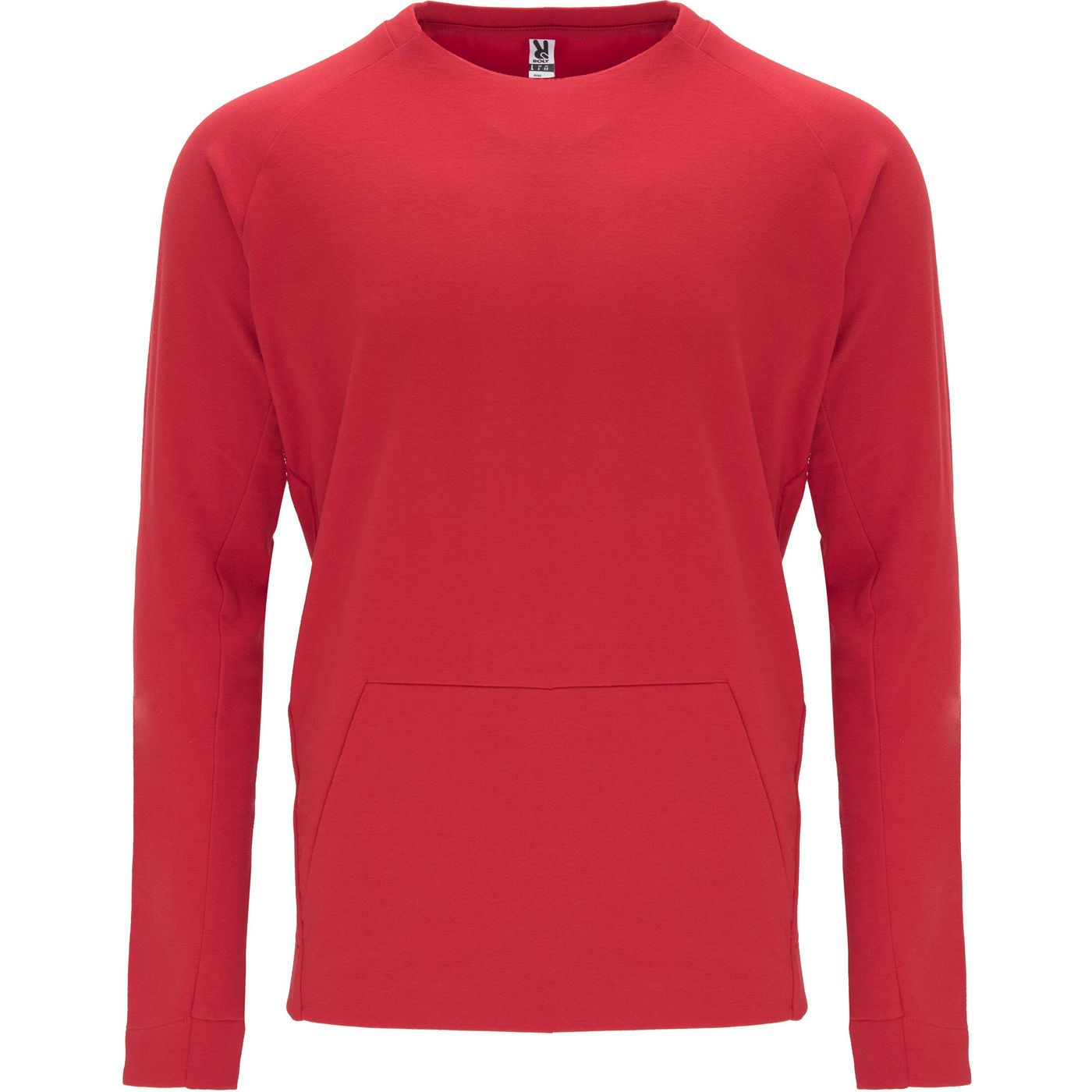 Sweat manches longues style raglan. Arrière du col et poignets en côte 1x1. Poche kangourou avec finition sans coutures. Coutures latérales en diagonales allant sur la partie frontale du sweat. Composition : 60% coton / 40% polyester.