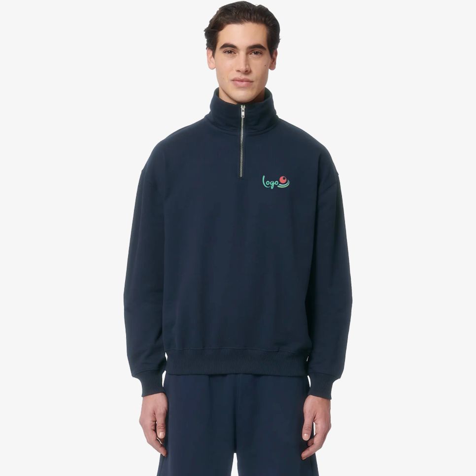 Le sweat coton Miller dry est un modèle unisexe à fermeture zippée sur un quart, avec coupe boxy, manches montées et col dans la matière principale. Finition par bord côtes 2x1 et surpiqûres doubles aux zones indiquées.