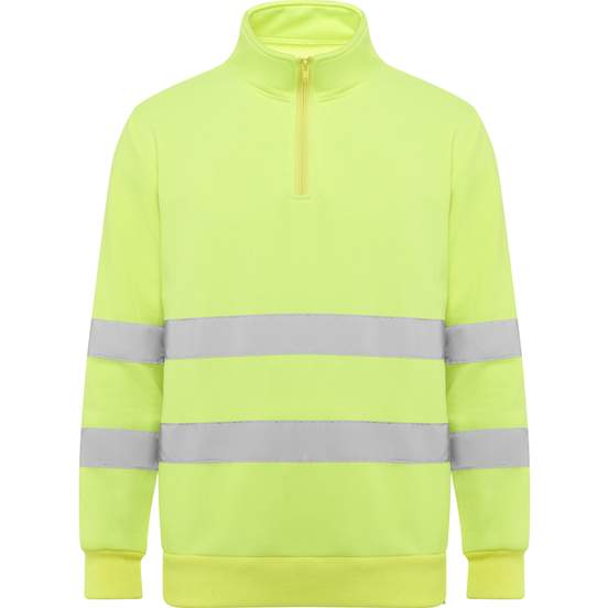 Le sweat visibilité Spica avec zip et col haut convient aux usages nécessitant une meilleure détection visuelle. Protège-menton intégré, bande de propreté renforcée au cou et étiquette détachable. Composition : 65% polyester, 35% coton.
