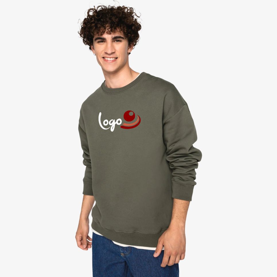 Le sweat-shirt à col rond oversize unisexe est conçu en coton biologique peigné. Il présente une coupe oversize avec épaules tombantes et un molleton gratté 3 fils pré-rétréci. Le col, le bas des manches et le vêtement comportent des bords côte 2 x 1 ainsi qu'une double surpiqûre sur le col et les manches. La finition de l'encolure intérieure est réalisée avec une bande propreté chevrons ton sur ton. Une demi-lune est positionnée au dos. Ce modèle est entièrement personnalisable.