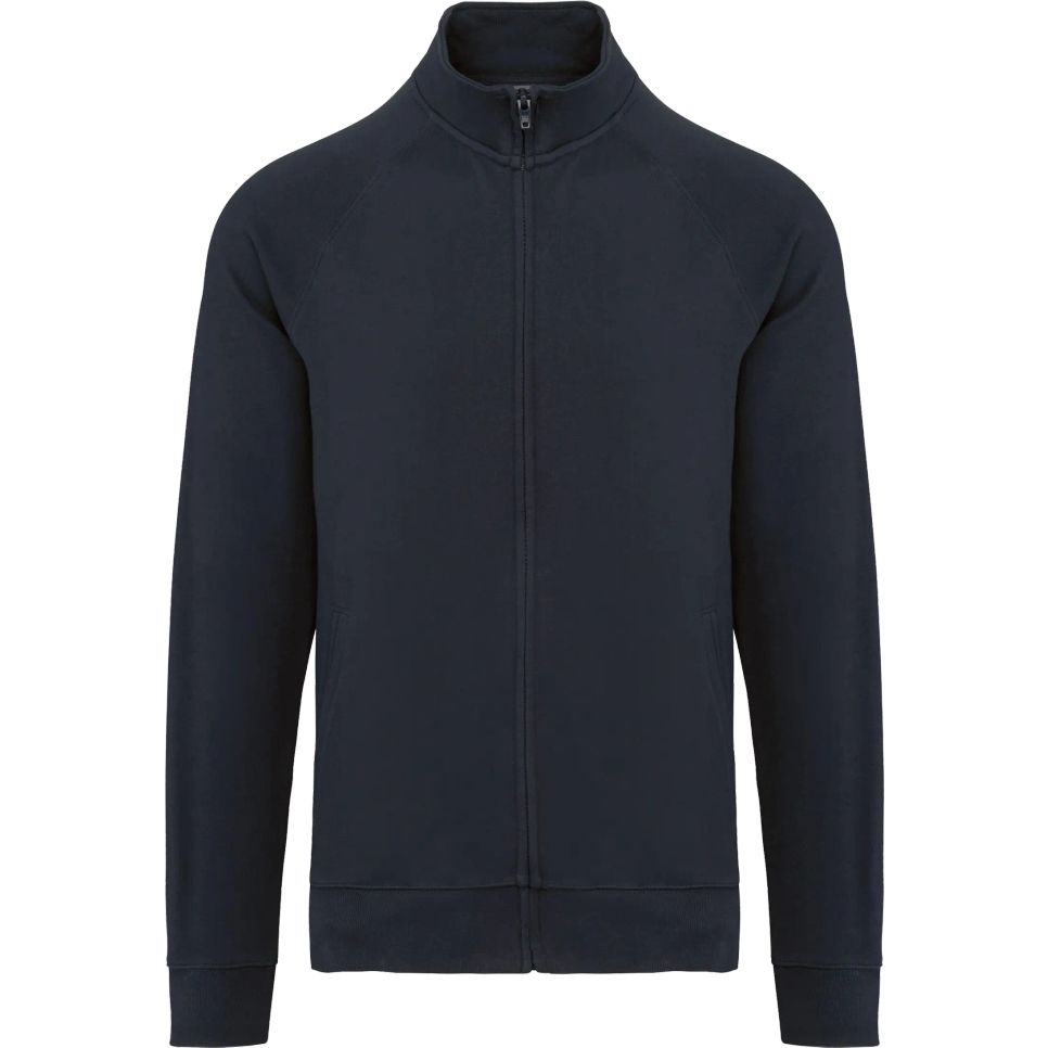 La veste molleton coton manches raglan unisexe en molleton non gratté french terry, à coupe ajustée, avec 2 poches côtés et zip plastique caché. Composition : 100% coton, sauf Oxford Grey (90% coton, 10% viscose).
