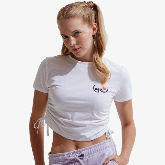 Le Crop top Froncé Femme Tridri est un tee-shirt crop-top court à manches courtes, avec col rond et fronces réglables sur les côtés grâce à des lacets. Composition : 100% coton. Convient à la personnalisation.