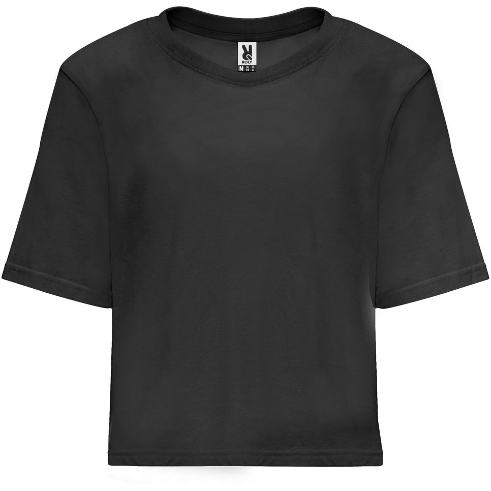 Le tee-shirt Dominica pour femme, à coupe large courte, avec manches courtes et col rond en côte 1x1 double épaisseur. Bande de propreté renforcée ton sur ton. Étiquette détachable. Personnalisable.