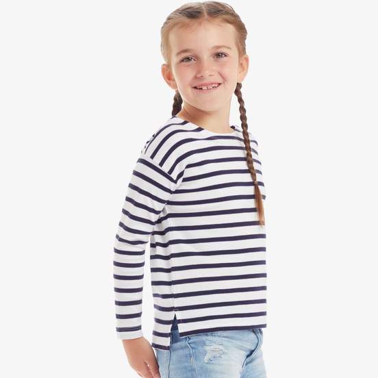 Le tee-shirt enfant Kids Breton t à manches longues convient à un usage quotidien. Rayures fil teint 8 mm, col rond, dos plus long et fentes latérales. Tissu doux extensible, étiquette détachable. Composition : 100% coton (bio ou conversion).