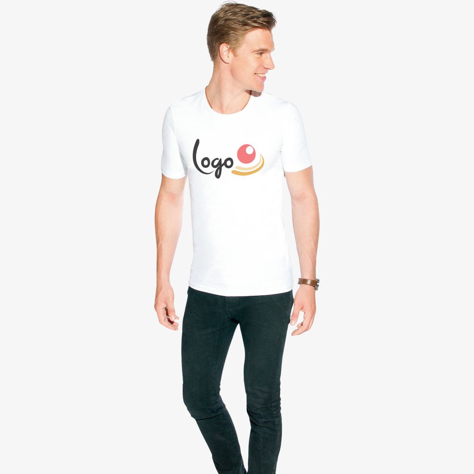 Le tee-shirt Men s slim fit t est un modèle à coupe ajustée en coton single jersey avec élasthanne, adapté à un usage quotidien et à la personnalisation.