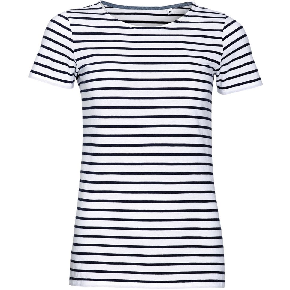 Le tee-shirt Miles Women est un mod\u00e8le femme \u00e0 col rond ray\u00e9, manches courtes et coupe ajust\u00e9e. Confection coup\u00e9e cousue, avec d\u00e9tail chambray \u00e0 l\u2019int\u00e9rieur du col. Convient pour une tenue du quotidien et peut \u00eatre personnalis\u00e9.