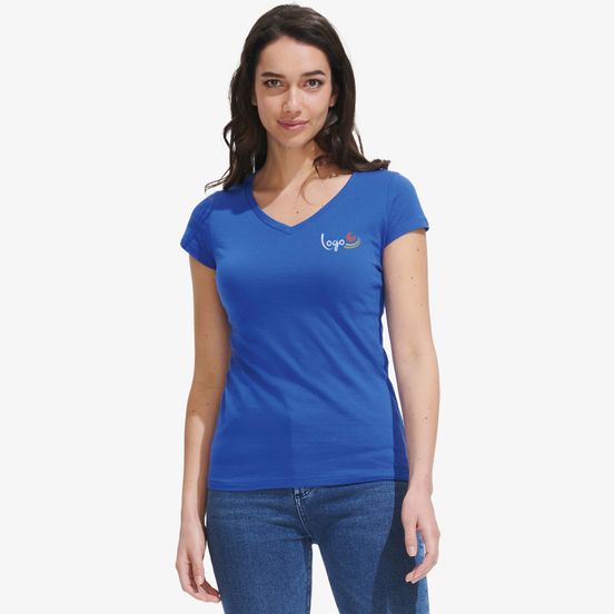 Le tee-shirt Moon en coton semi-peigné convient à un usage quotidien. Sa coupe cintrée et son col V avec bord côte élasthanne assurent un ajustement près du corps, avec bande de propreté au col. Adapté à la personnalisation.