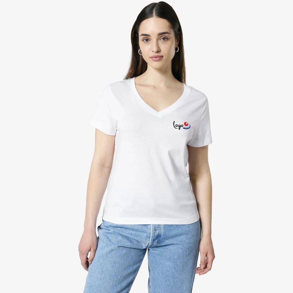 Le tee-shirt col V Stella isla pour femme en 100% coton biologique filé peigné. Manches montées, bande de propreté intérieure au col et finitions par surpiqûre à double aiguille aux poignets et à l'ourlet.