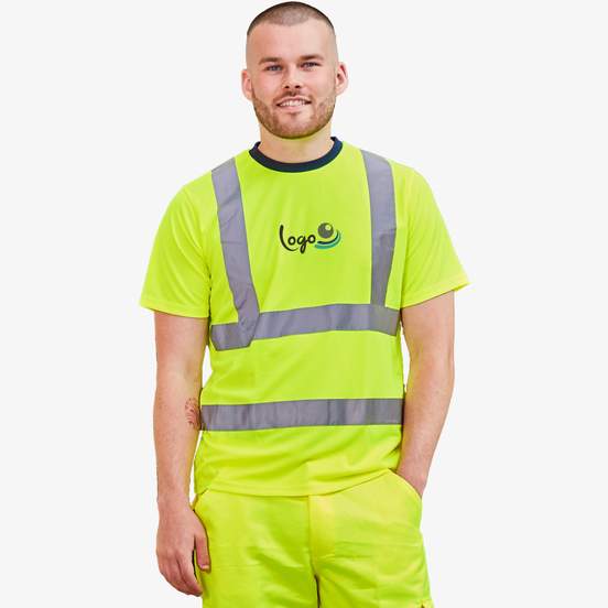 Le T Shirt à Visibilité Renforcée est un tee-shirt en 100 % polyester avec bandes haute-visibilité et bande réfléchissante sur l'épaule et autour du corps. Col côtelé contrasté et surpiqûres doubles aux épaules et aux ourlets. Personnalisation possible.
